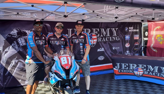 Cook’s team for the weekend included U.S. Marine veteran and Motorcycle Xcitement rider coach Dakari Harris and U.S. Marine veteran Don Williams – a participant in the Veterans Empowered through Motorsports program.